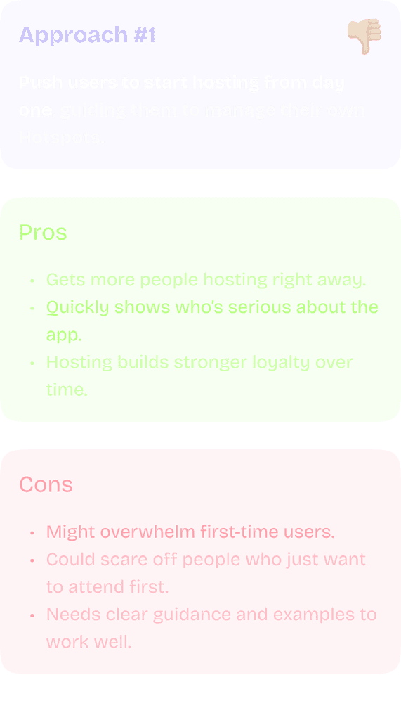 Further more, it discouraged organic hosting, undermining the product’s intended social and experiential purpose.